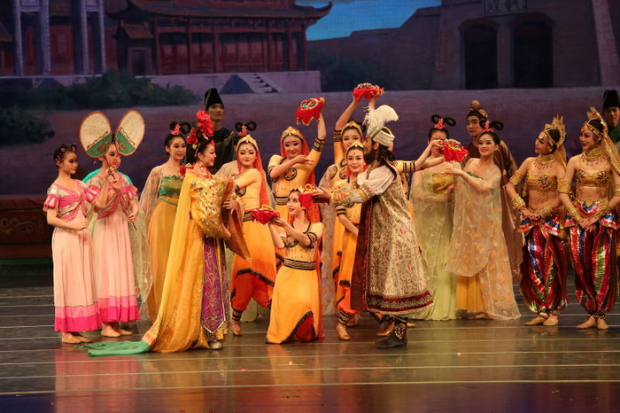 舞臺上,舞者華美的服裝,張力十足的舞蹈動作,以及恢弘的舞臺背景,將瑰麗多彩的敦煌壁畫搬上舞臺,再現(xiàn)了敦煌文化的博大精深和古絲綢之路的繁榮昌盛。通過對創(chuàng)造輝煌燦爛敦煌文化的勞動人民形象的深度刻畫,弘揚了絲綢之路“友好通商、互惠共融”的優(yōu)良傳統(tǒng),歌頌了中外人民源遠(yuǎn)流長的偉大友誼。